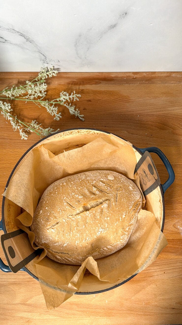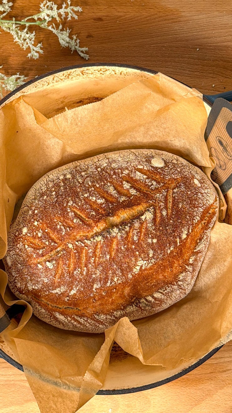 Carefully transfer the dough (on the parchment) into the preheated Dutch oven. Cover and bake for 25 minutes.Remove the lid and continue baking for another 20–25 minutes, until the crust is deep golden brown and crisp.Transfer the loaf to a wire rack and let it cool completely—at least 1 hour—before slicing.10. Enjoy / Store