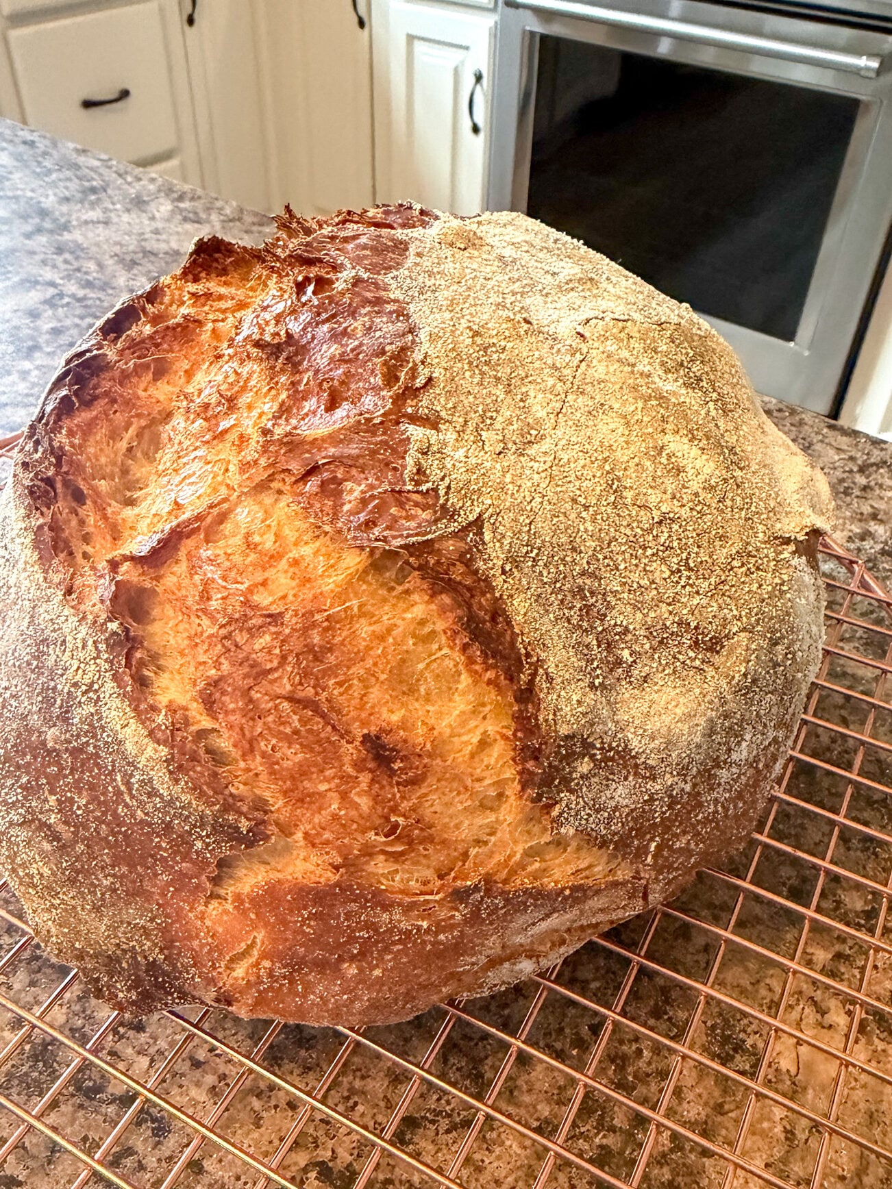 - Dutch Oven Tip: If you don’t have one, bake on a preheated baking stone with a pan of hot water on the lower rack to create steam.