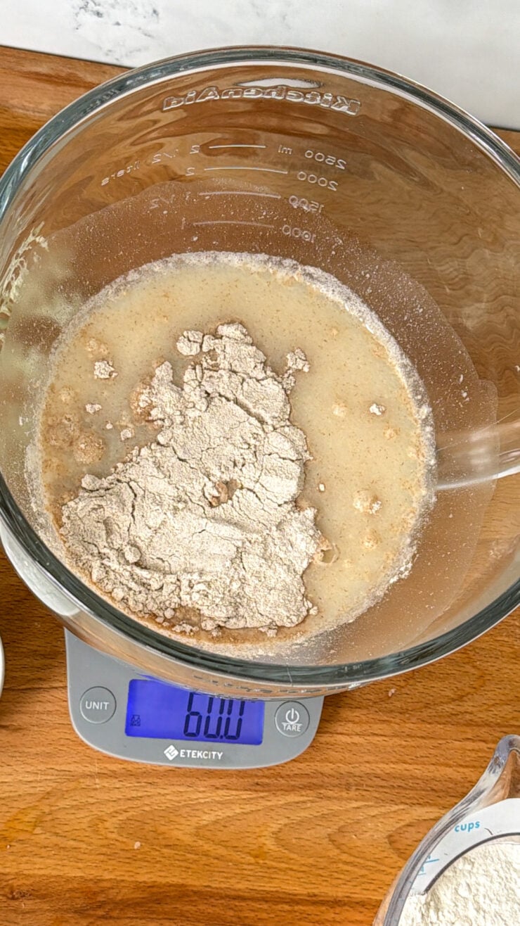 - Add equal weights of flour and water – I rotate between 1 cup whole wheat flour and 1 cup warm water and then 1 cup bread flour and 1 cup warm water for this.
