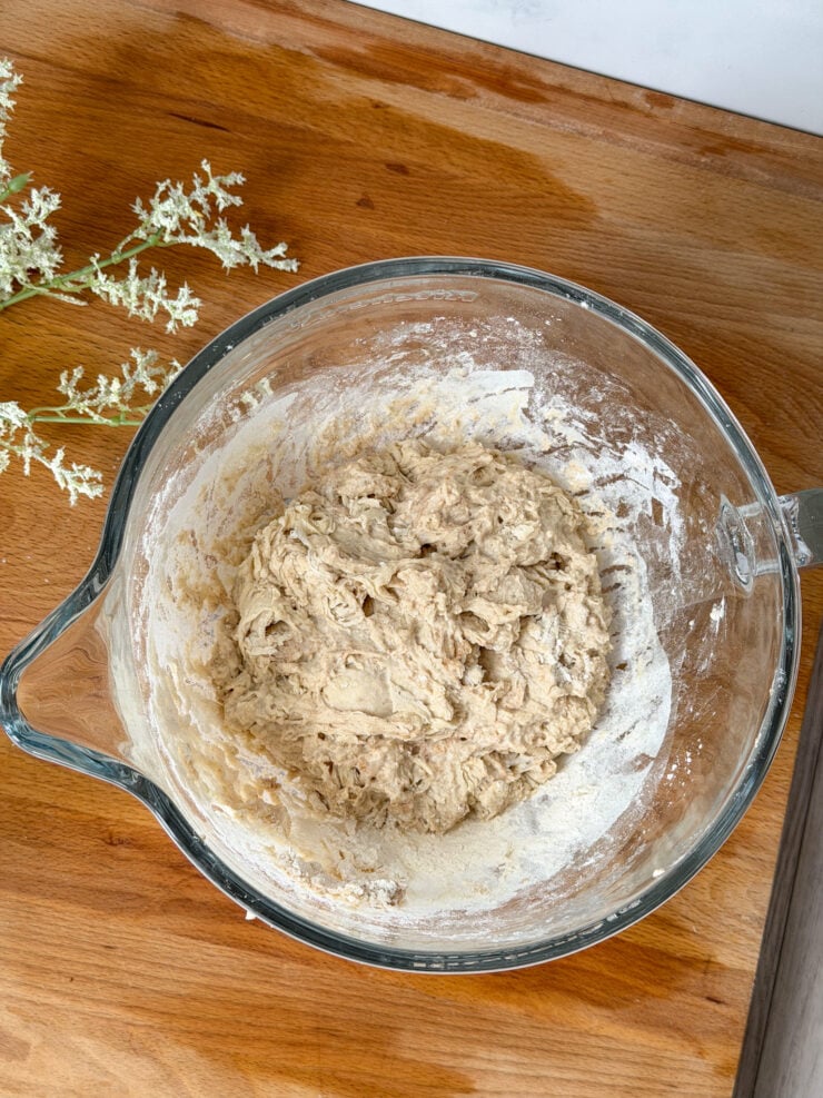 With damp hands, grab one side of the dough, stretch it upward, and fold it over itself. Rotate the bowl a quarter turn and repeat until you’ve stretched and folded all four sides. Cover and rest for 30 minutes. Repeat this process 3–4 times over the next 2 hours. Each set strengthens the dough and builds structure.3. Bulk Fermentation (First Rise)