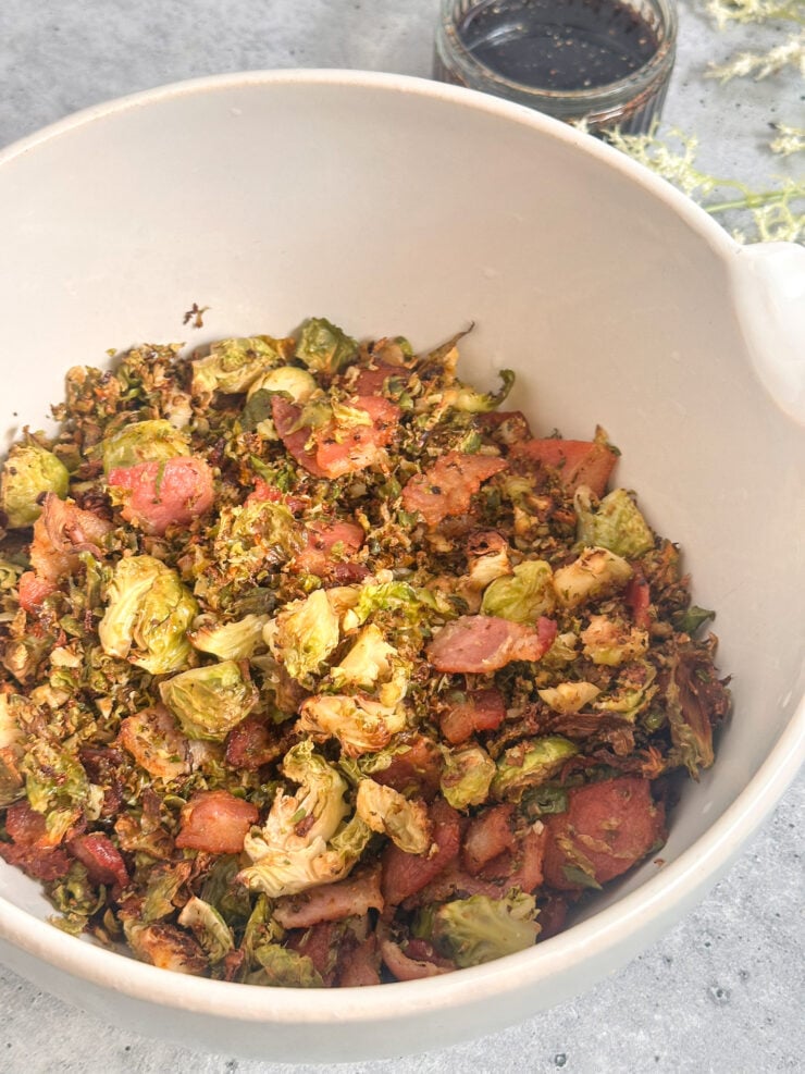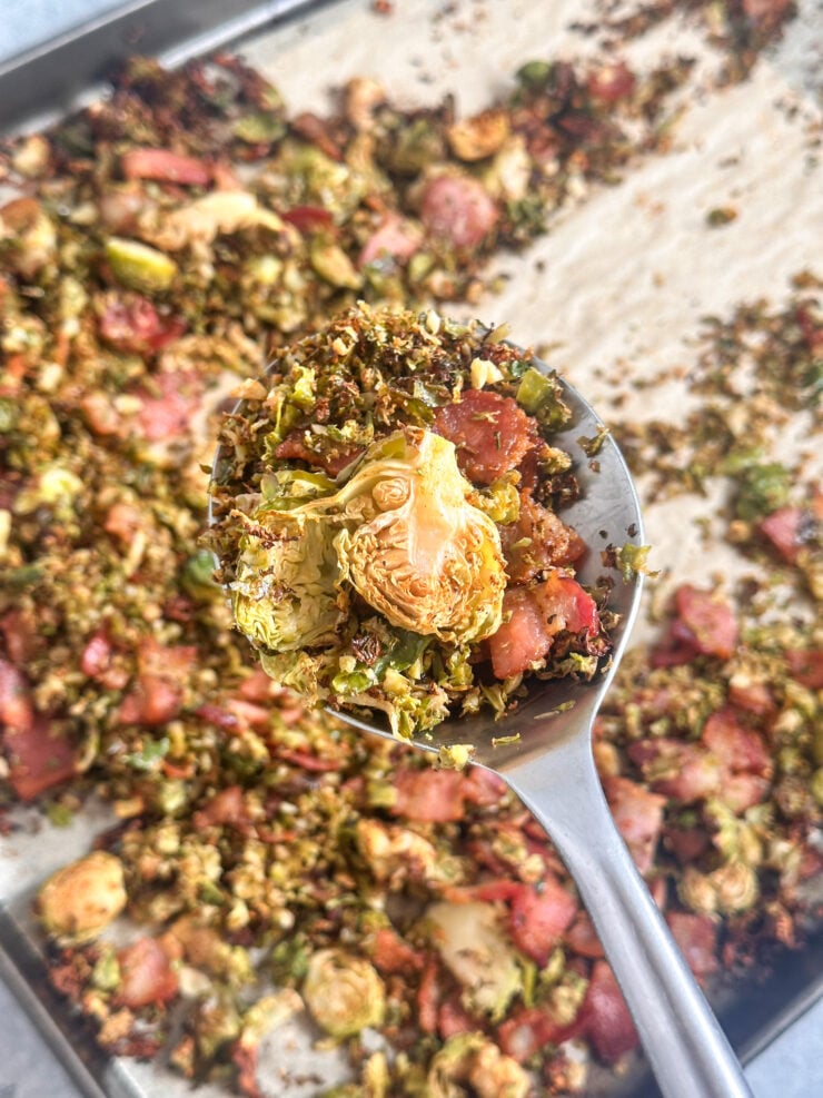 Add bacon: Sprinkle bacon over the sprouts and roast for another 10–15 minutes until crispy and golden.